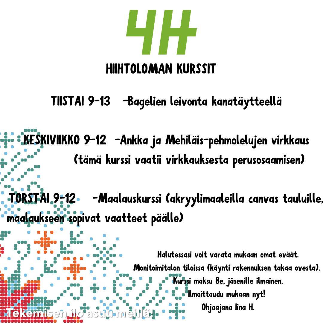 Kurssipäivät kestävät vaihdellen 2-4 tuntia. Varaa tarvittaessa omat eväät mukaan.